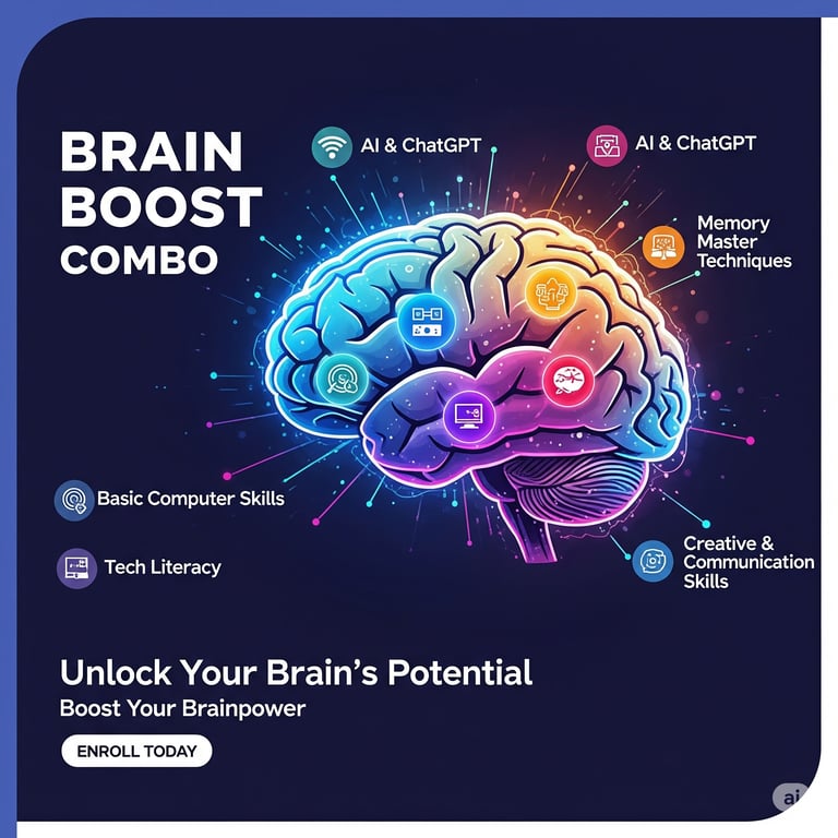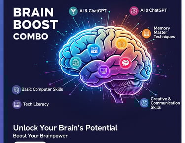 Ignite your child's potential with our Bright-Boost Combo! This dynamic course combines cutting-edge AI & ChatGPT, essential Basic Computer and Tech Literacy skills, powerful Memory Master techniques, and vital Creative & Communication Skills to empower them for tomorrow's world.