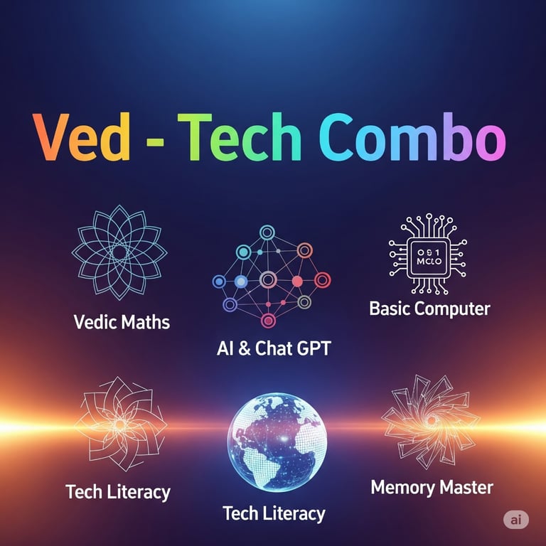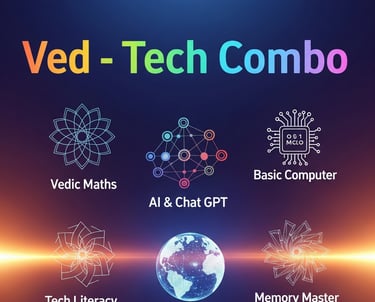 Empower your child's genius with our Ved-Tech Combo! We blend the incredible speed of Vedic Maths for lightning-fast calculations with cutting-edge AI & ChatGPT, essential Basic Computer skills, and vital Tech Literacy, all while training them to be a Memory Master.